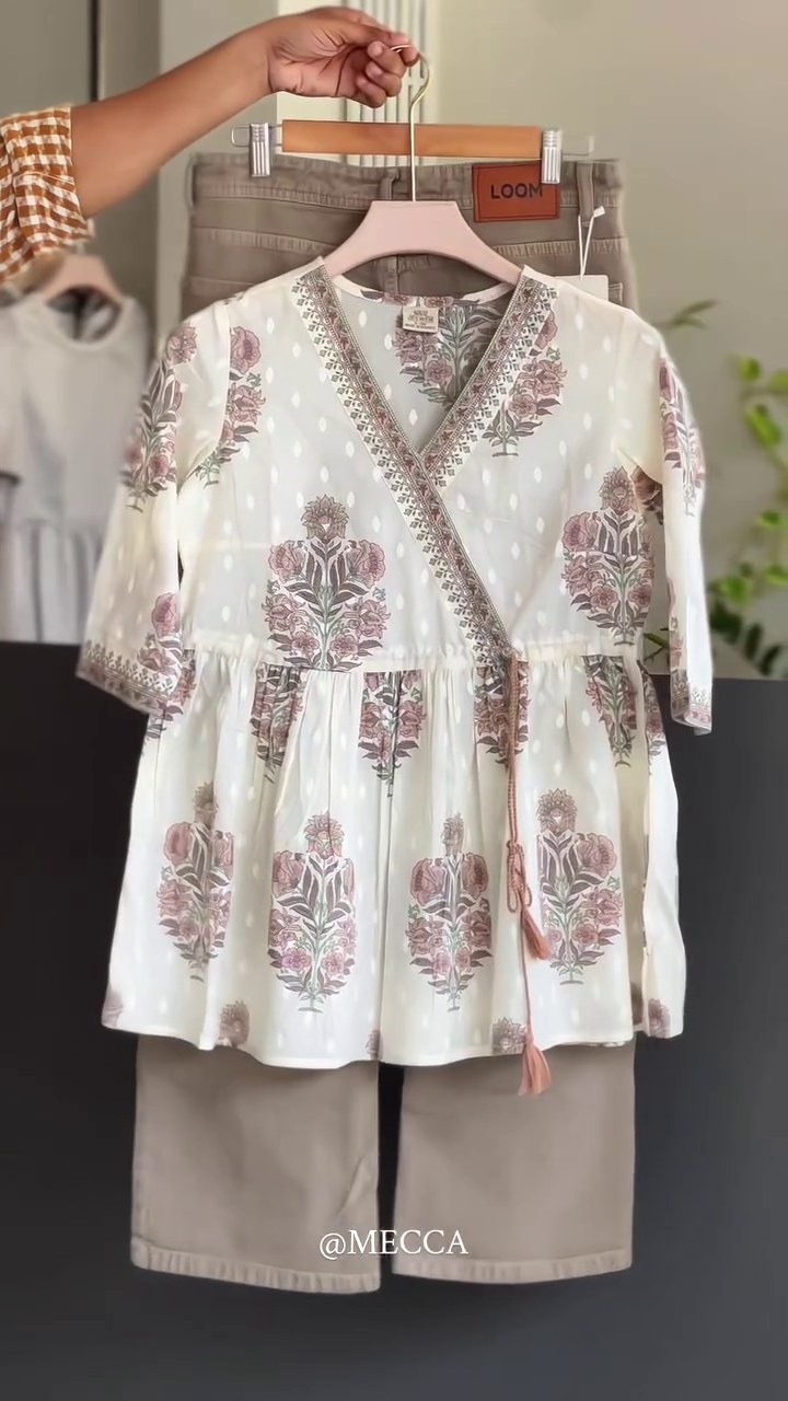 Step into effortless style with this beautifully crafted floral printed top paired with neutral-toned pants. The top features a charming wrap design with delicate block print flowers, intricate borders, and a soft tassel tie, all in a lightweight, breathable fabric — perfect for sunny days! 🌞
